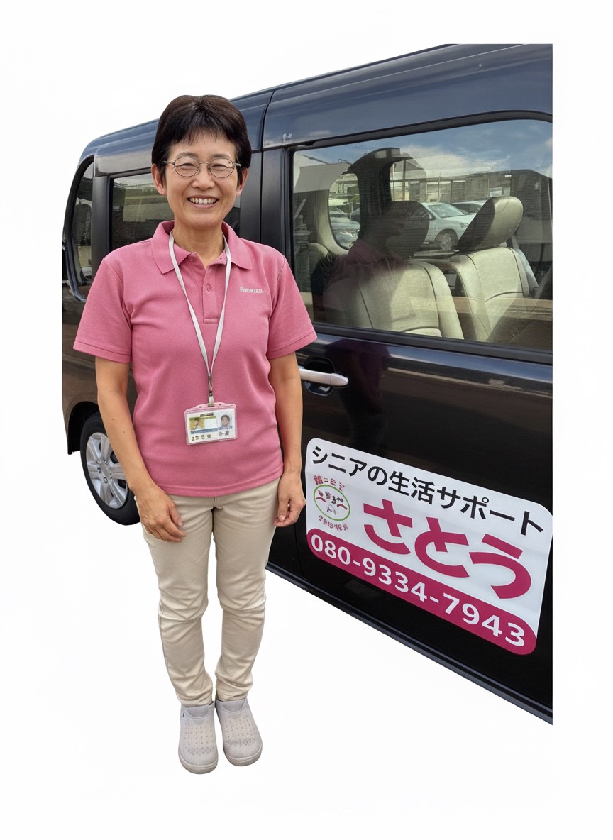 こんにちは、シニアの生活サポートさとう代表の佐藤です。当事業所では、地域の皆さまに寄り添い、日々の生活をしっかりとサポートすることを使命としています。お客様が安心して日々の生活に専念できるよう、私たちがバックアップいたします。これまでに多くの高齢者の方々の生活支援をお手伝いしてまいりました。日々の生活で不安を感じる方も多いかと思いますが、どんなご相談でも丁寧にお伺いし、最適な解決策を一緒に見つけることを大切にしています。地域密着型のサポート事業所として、迅速で誠実な対応を心がけ、お客様一人ひとりに合ったサービスを提供いたします。どんな些細なことでも、ぜひお気軽にご相談ください。